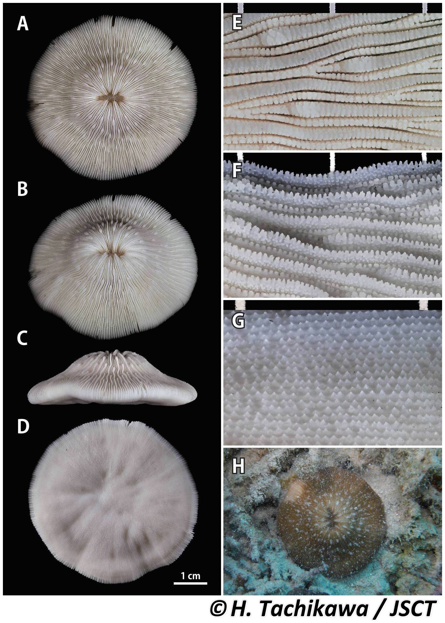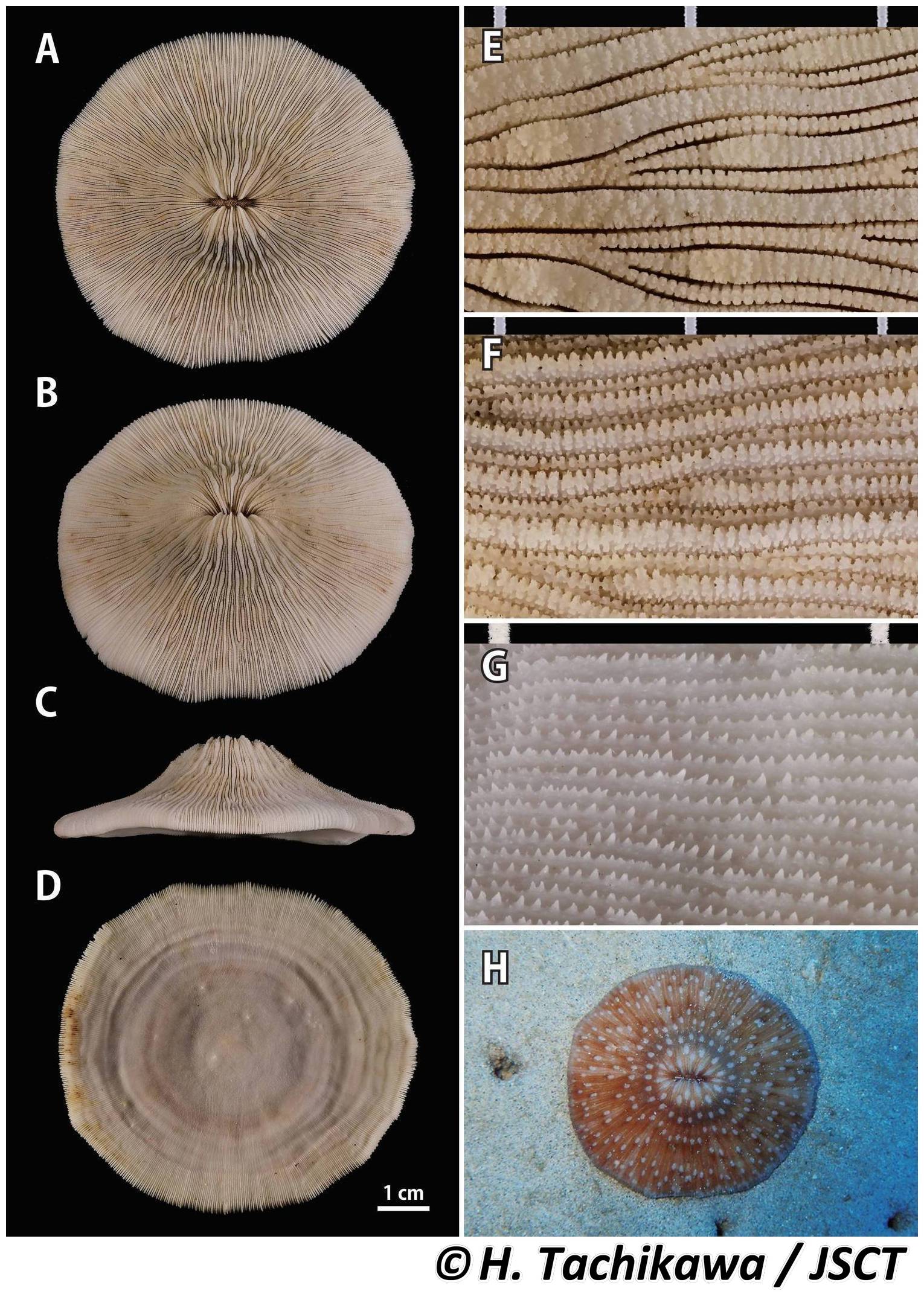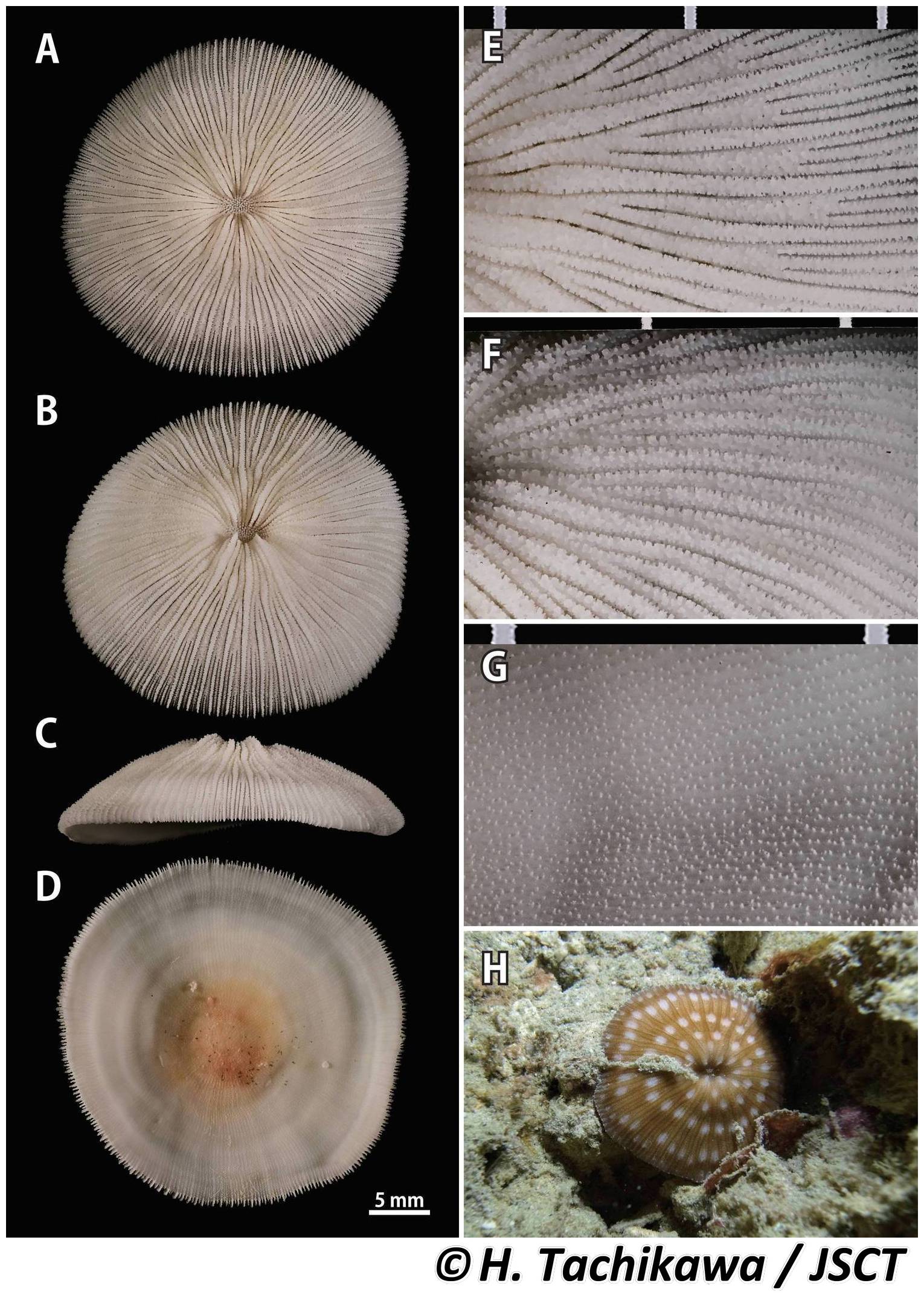 図1A–H. CMNH-ZG 06749. 西表島網取湾, 水深 27 m. 2014-07-01. サンゴ体の長径 52.0 mm.