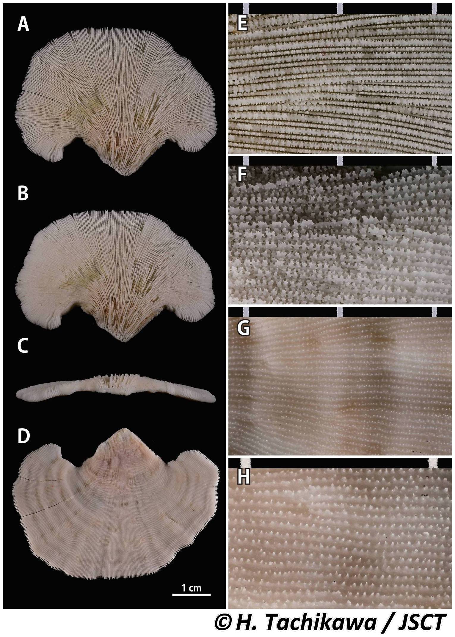 図10A–H. CMNH-ZG 09708a. 奄美大島阿鉄海岸, 水深 12 m. 2019-03-02. サンゴ体の長径 40.1 mm.