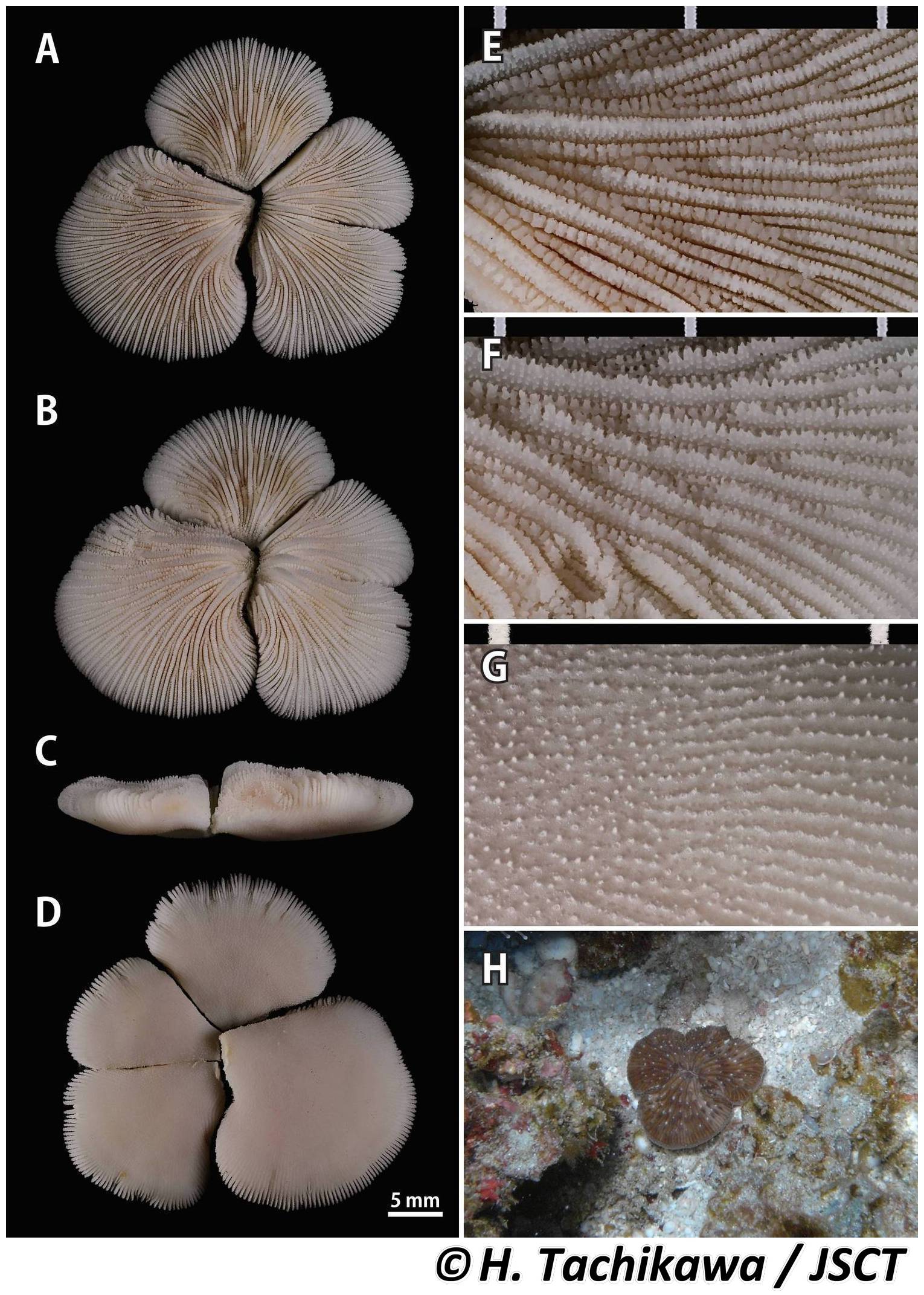 図3A–H. CMNH-ZG 06916a.宮古島狩俣, 水深 26 m. 2014-10-23. サンゴ体の長径 23.1 mm.