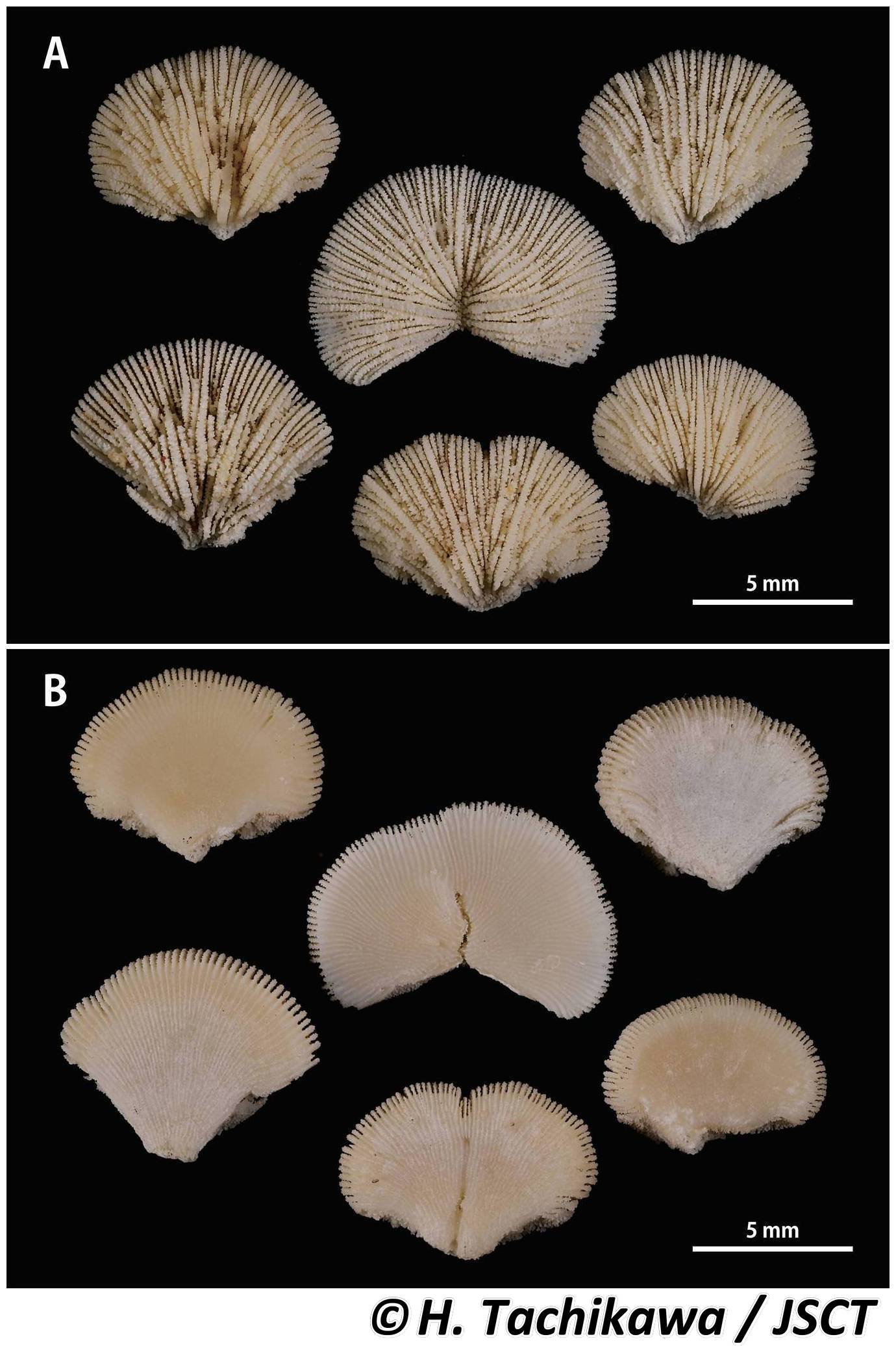 形態:成体のサンゴ体は自由生活性で通常は単口性。サンゴ体は通常型またはワレクサビライシ型のいずれかの形状。観察に用いた通常型の標本の長径は 2.8~7.1 cm (N=4)